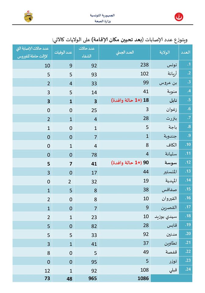 ليبلغ العدد الجملي للمصابين بهذا الفيروس، وذلك بعد التثبت من المعطيات وتحيينها 1086 حالة مؤكدة موزعة كالآتي: 965 حالة شفاء و48 حالة وفاة (لم يتم تسجيل حالات وفاة جديدة) و73 حالة إصابة لا تزال حاملة للفيروس وهي بصدد المتابعة من بينها 01 حالة تقيم حاليا في المستشفى.
