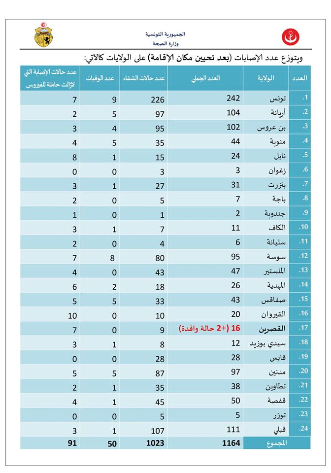 وقد تم تسجيل 8 تحاليل إيجابية من بينها 2 حالات إصابة جديدة وافدة من ضمن الذين تم إجلاؤهم وهم موجودون في مراكز الحجر الصحي الإجباري، و06 تحاليل إيجابية لحالات إصابة سابقة ما تزال حاملة للفيروس، ليصبح العدد الجملي للمصابين بهذا الفيروس، وذلك بعد التثبت من المعطيات وتحيينها، 1164 حالة مؤكدة موزعة كالآتي: 1023 حالة شفاء و50 حالة وفاة و91 حالة إصابة لا تزال حاملة للفيروس وهي بصدد المتابعة.
