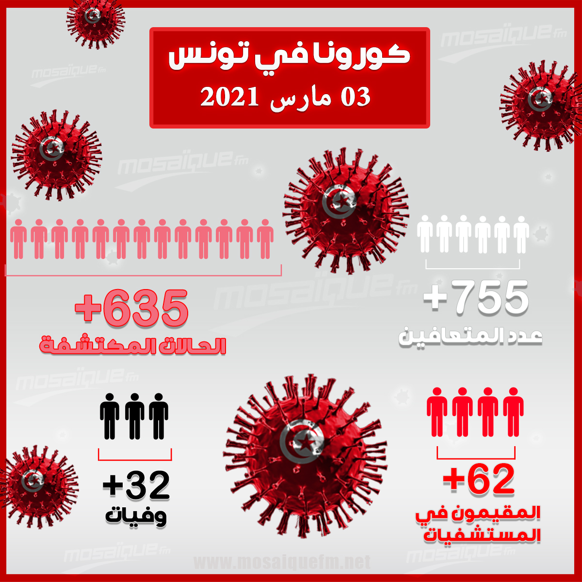 سجّلت وزارة الصحة إلى غاية يوم 3 مارس الجاري، 32 حالة وفاة جراء فيروس كورونا و635 إصابة جديدة بالفيروس من جملة 3672 تحليلا مخبريا.