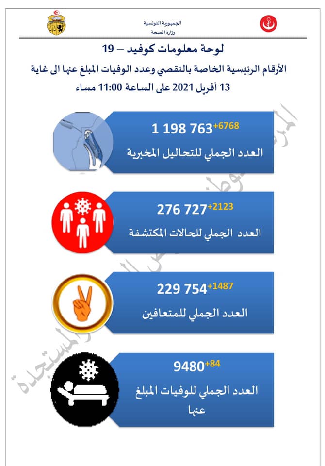 أعلنت وزارة الصحة تسجيل 84 وفاة جديدة بفيروس كورون خلال الأربع والعشرين ساعة الماضية ليرتفع العدد الجملي للوفيات منذ ظهور الجائحة في تونس إلى 9480 وفاة.