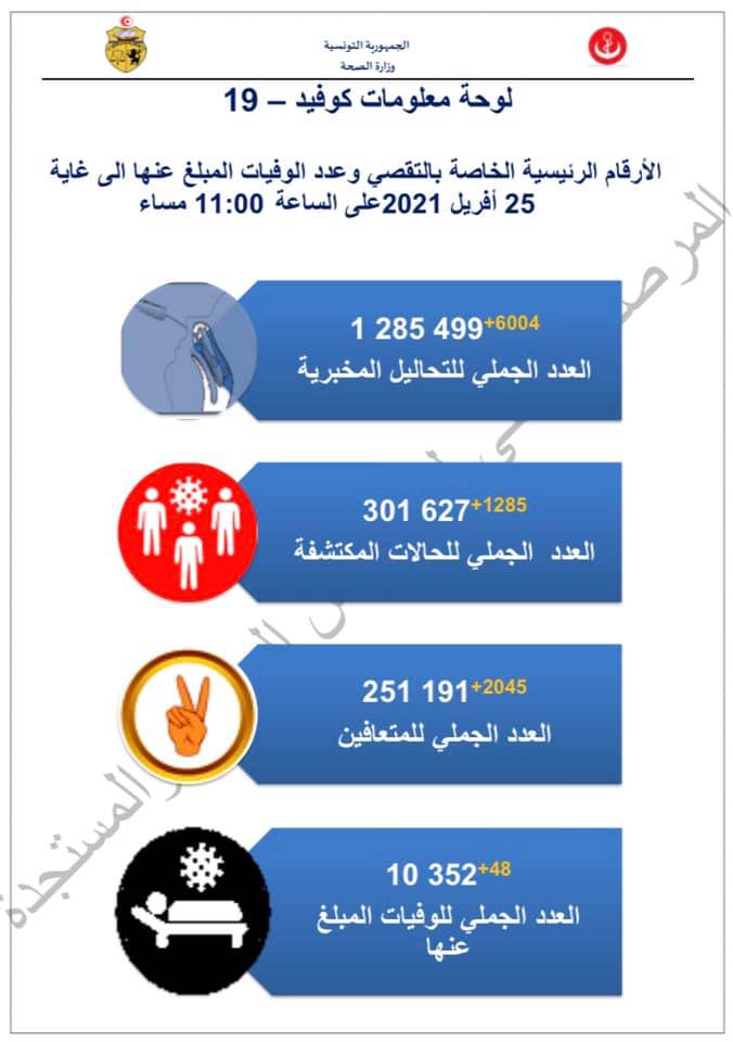 أعلنت وزارة الصحة في بلاغها اليوم الإثنين، عن اكتشاف 1285 إصابة جديدة بفيروس كورونا، و48 وفاة جديدة بالفيروس، وذلك في الأرقام المسجلة إلى غاية يوم الأحد 26 أفريل 2021.