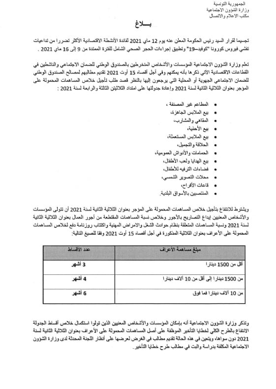 نشرت وزارة الشؤون الاجتماعية وثيقة توضيحية للمساهمات المحمولة على المؤجر بعنوان الثلاثية الثانية لسنة 2021 و إعادة جدولتها على امتداد الثلاثيتين الثالثة والرابعة لسنة 2021 تفسّر كيفية تأجيل خلاصها.