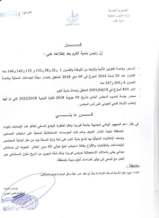 أعلنت بلدية الكرم تخصيص جزء من مقرّها لفائدة وزارة الصحة من أجل إحداث مستشفى ميداني يُعني بالحالات الاستعجالية لمرضى كوفيد، ويتّسع هذا الفضاء لـ60 سرير إنعاش، حسب ما أكده رئيس البلدية فتحي العيوني في بلاغ اليوم الثلاثاء.