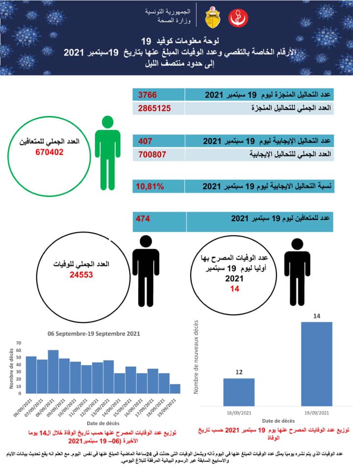 كما سجلت الوزارة، حسب بلاغها الصادر مساء اليوم الاثنين 20 سبتمبر 2021، حول مستجدات الوضع الوبائي بالبلاد، 14 وفاة مصرح بها أوليا يوم 19 سبتمبر، ليبلغ العدد الإجمالي للوفيات منذ ظهور الفيروس في تونس 24 ألفا و553 وفاة.