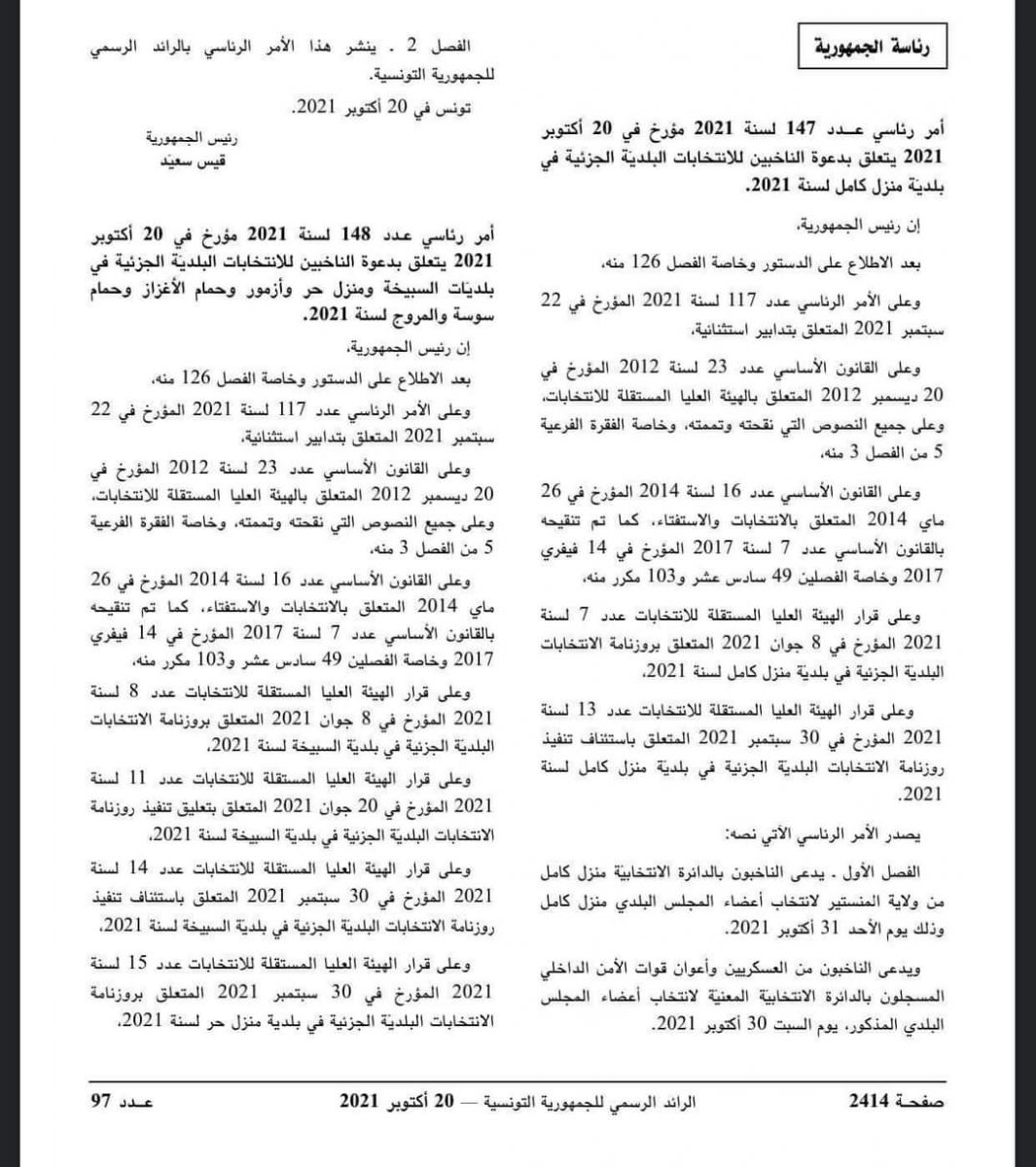 أصدر رئيس الجمهورية قيس سعيّد أوامر رئاسية لدعوة الناخبين للانتخابات البلدية الجزئية في بلديات منزل كامل و السبيخة و منزل حر و أزمور و حمام الغزاز و حمام سوسة و المروج.