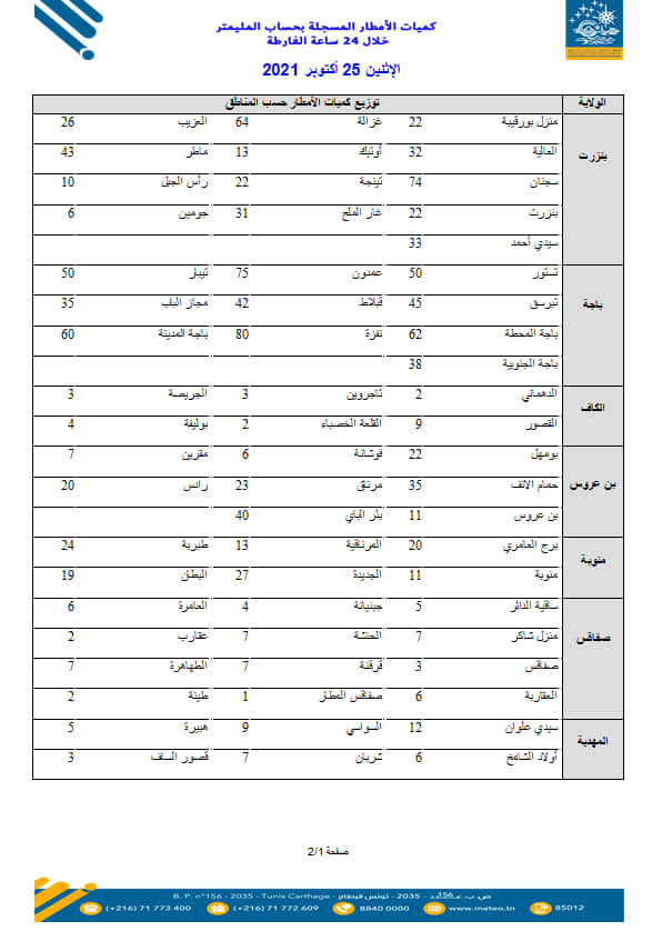 شهدت أغلب ولايات الجمهورية خلال الساعات الأخيرة، نزول كميات هامّة من الأمطار، فيما نشر المعهد الوطني للرصد الجوي على موقعه الإلكتروني صباح اليوم الاثنين 25 أكتوبر 2021 بيانات لأهم الكميات المسجلة في جهات مختلفة خلال الـ24 ساعة الأخيرة.