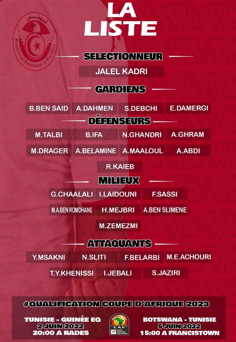 وللإشارة فان الناخب الوطني جلال القادري سيعقد ندوة صحفية يوم 1 جوان 2022 أي قبل يوم من مباراة تونس غينيا الاستوائية بقاعة المؤتمرات بالملعب الأولمبي حمادي العقربي برادس بداية من الساعة الخامسة مساء.