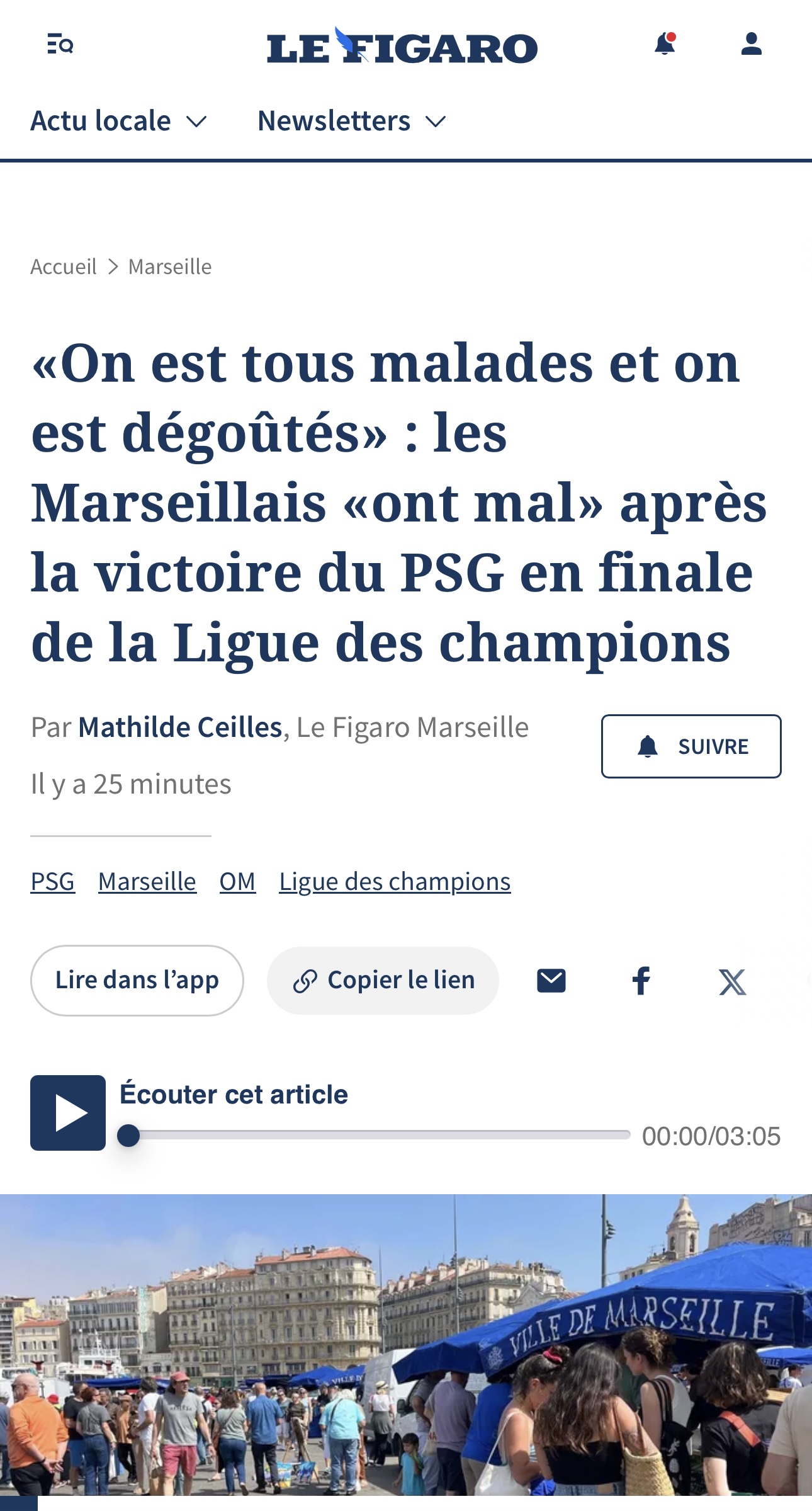 من جهتها، نشرت صحيفة لو فيغارو (Le Figaro)، صباح اليوم الأحد، تحقيقًا استطلعت من خلاله آراء أحباء مرسيليا بعد تتويج باريس سان جيرمان برابطة الأبطال، كان عنوانه "نشعر بالمرض وبالاشمئزاز.. مرسيليا ليست في حالة جيدة بعد تتويج باريس سان جيرمان..".
