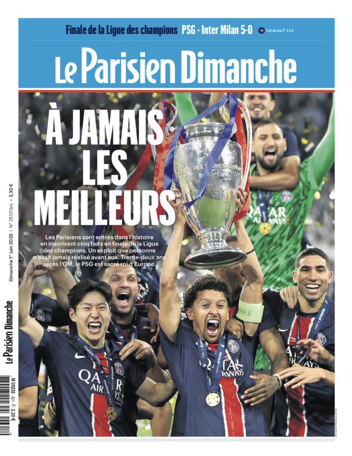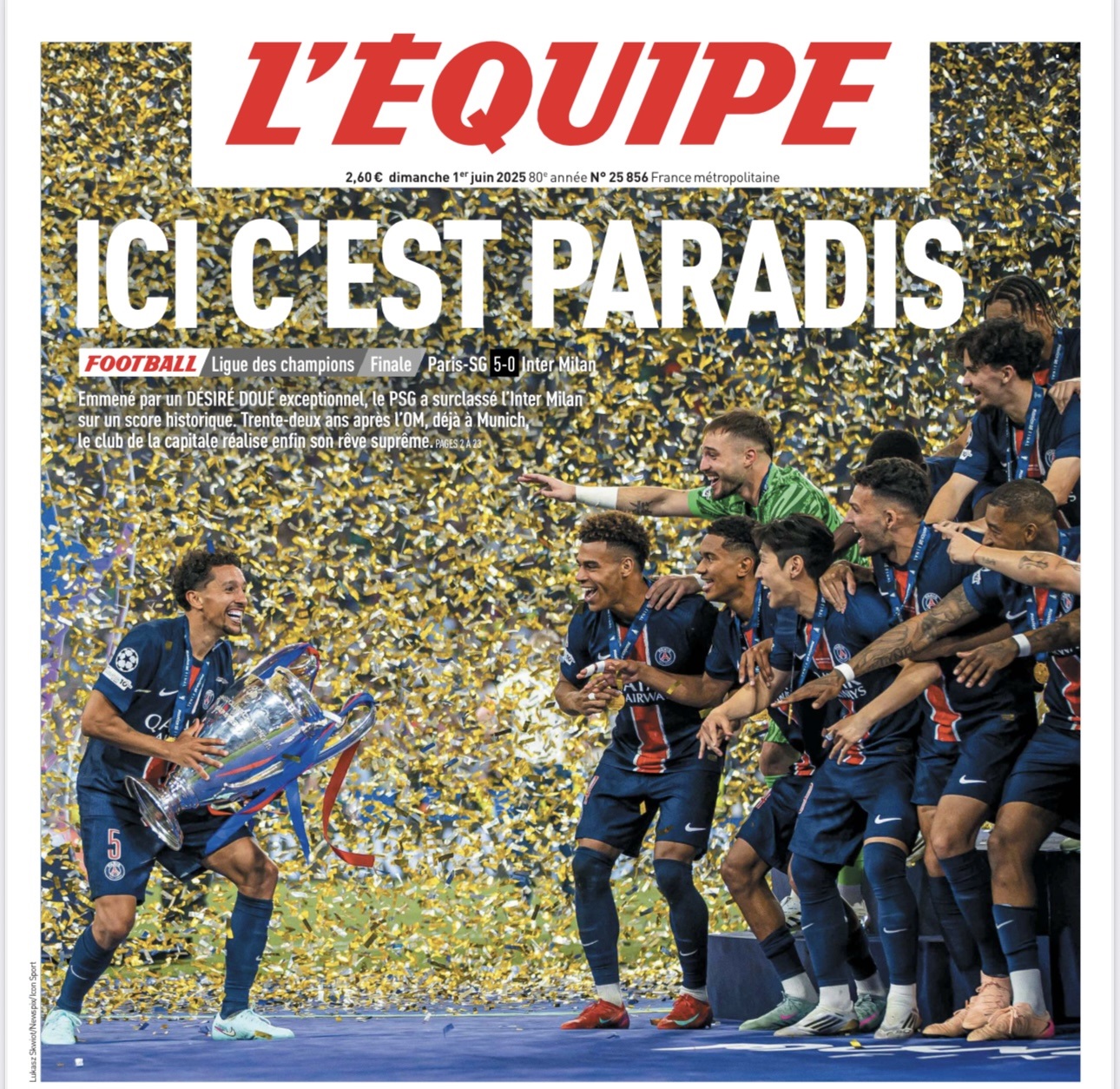 مقابل ذلك، سيطر الشعور بالسعادة على عناوين الصحف الباريسية، حيث جاء في اقتتاحية لو باريزيان (Le Parisien) "الأفضل إلى الأبد"، في حين اختارت صحيفة ليكيب عنوانًا لافتتاحياتها "Ici c’est paradis"، احتفاءً بتتويج باريس سان جيرمان.