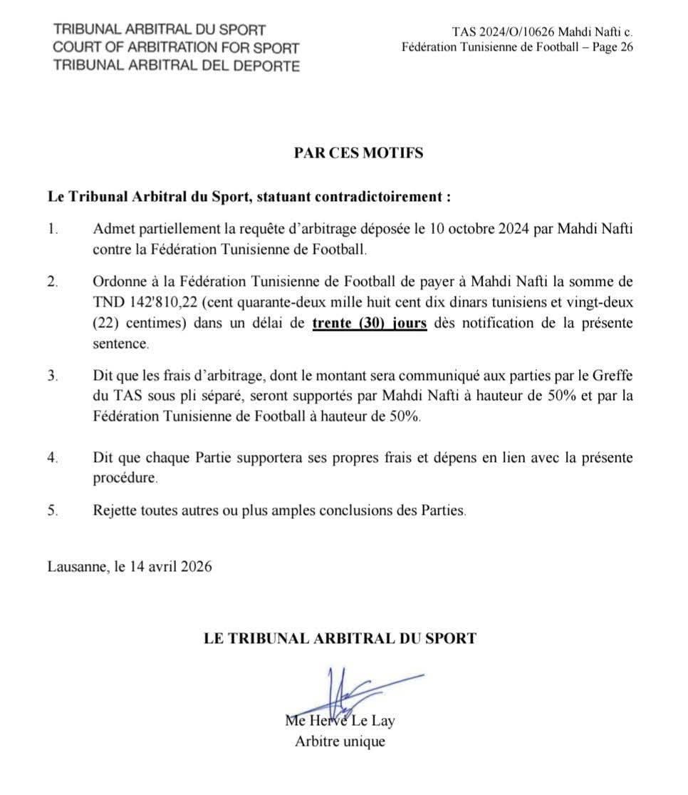 أصدرت محكمة التحكيم الرياضي ''التاس''، الثلاثاء، قرارها النهائي في خصوص القضيّة التي رفعها مهدي النفطي ضدّ الجامعة التونسية لكرة القدم.
