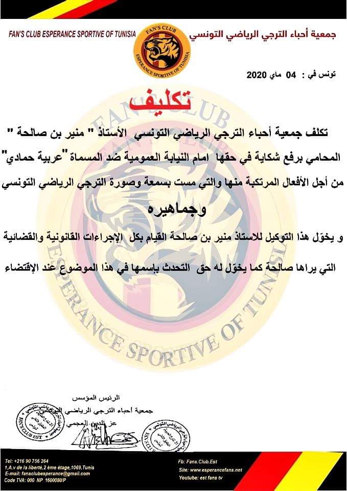أكّد المحامي منير بن صالحة أنّه تمّ تكليفه من طرف جمعيّة أحباء الترجّي الرياضي التونسي لرفع شكاية أمام النيابة العمومية ضدّ الإعلاميّة عربية حمادي من أجل ''الأفعال المرتكبة منها والتي مسّت بسمعة وصورة الترجي الرياضي التونسي وجماهيره''.