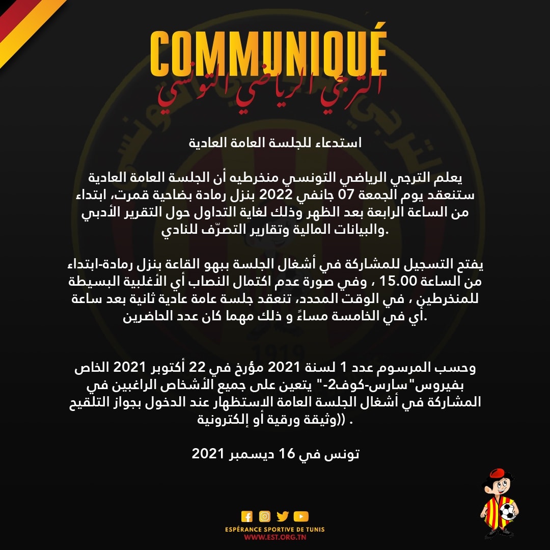 أعلنت إدارة الترجي الرياضي التونسي أن الجلسة العامة العادية ستعقد يوم الجمعة 7 جانفي 2022 وسيتم خلالها عرض التقريرين المالي والأدبي .