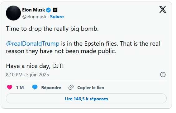 Mais c’est une autre déclaration qui a provoqué un véritable séisme : Elon Musk affirme que Donald Trump figure dans le dossier Epstein, du nom du financier américain accusé de trafic sexuel de mineures.
