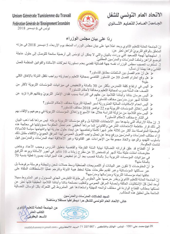 La Fédération Générale de l'Enseignement Secondaire a publié, ce jeudi, un communiqué portant sur le maintien des revendications du secteur et sur sa disposition inconditionnelle à effectuer des mouvements protestataires sous toutes les formes possibles, en riposte au communiqué du conseil ministériel.