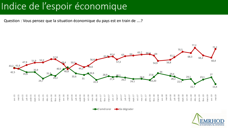 75.2% des Tunisiens interrogés par Emrhod consulting, trouvent que la situation économique du pays, ne cesse de se détériorer, soit une hausse de 15 points par rapport à avril 2019 (60.4%).