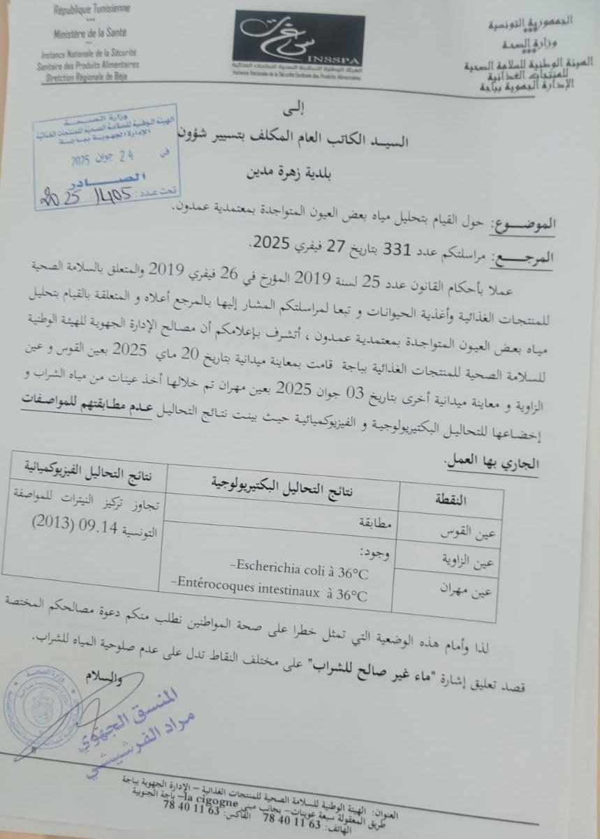 واستند البلاغ إلى مراسلة في الغرض من الإدارة الجهوية للهيئة الوطنية للسلامة الصحية للمنتجات الغذائية، والتي تضمنت نتائج تحاليل مخبرية أجريت على مياه العيون الثلاث المذكورة.