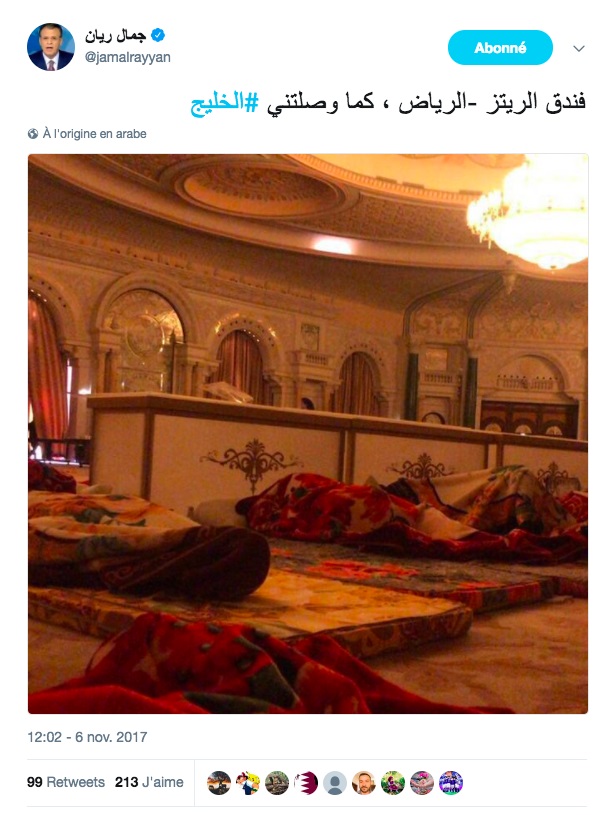 نشر الإعلامي الفلسطيني بقناة الجزيرة جمال ريّان صورة على حسابه بتويتر دوّن عليها ''فندق الريتز -الرياض ، كما وصلتني''، وهو الفندق الذي يعتقد أنّه تمّ احتجاز عدد من الأمراء والمسؤولين ورجال الاعمال السعوديين داخله.