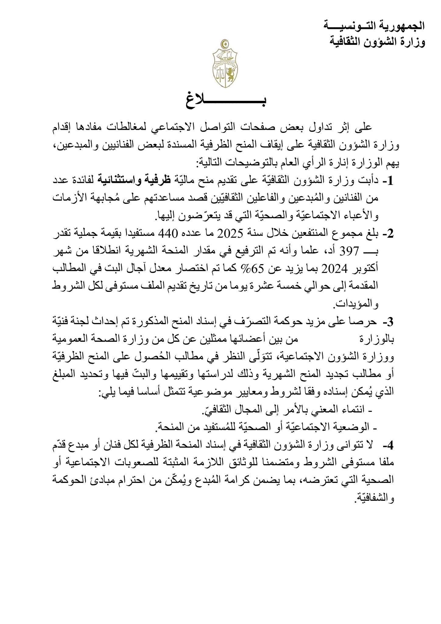 وأوضحت الوزارة في بلاغ لها مساء اليوم الاثنين، ردا على ما اعتبرته "مغالطات تم تداولها على وسائل التواصل الاجتماعي مفادها الإقدام على إيقاف المنح الظرفية المسندة لبعض المبدعين والفنانين، أن عدد المنتفعين خلال سنة 2025 بلغ 440 مستفيدا بقيمة جملية تقدر ب397 ألف دينار وأنه قد تم الترفيع في مقدار المنحة الشهرية انطلاقا من أكتوبر 2024 بما يزيد عن 65 بالمائة، وأنه قد تم اختصار معدل آجال البت في المطالب المقدمة إلى حوالي 15 يوما من تاريخ تقديم الملف مستوفى لكل الشروط والمؤيدات.