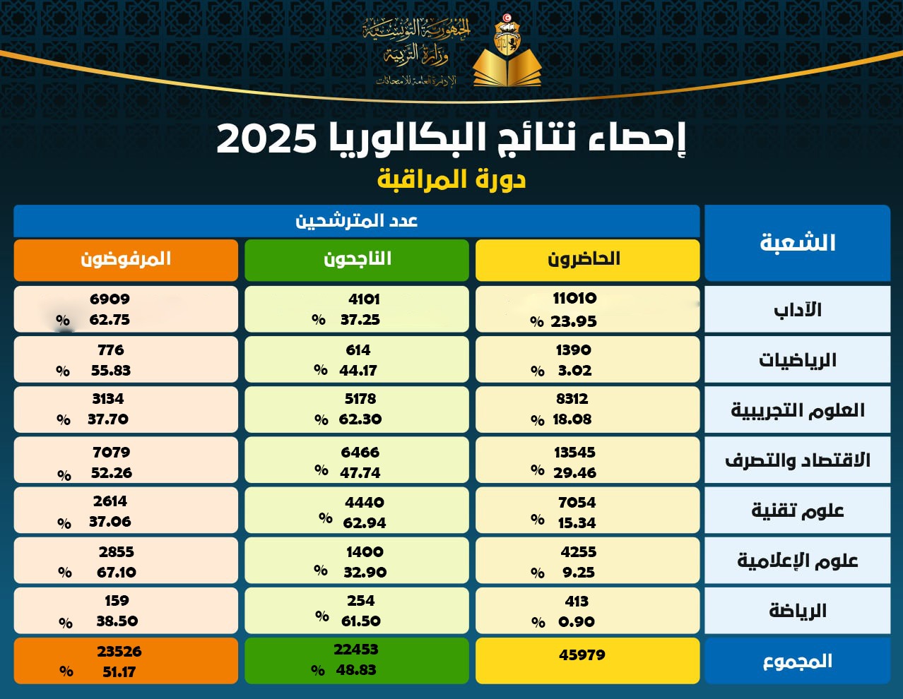 وبلغ عدد الناجحين في دورة المراقبة 22453 تلميذا فيما قدّر عدد المرفوضين بـ23526 تلميذا من مجموع 45979 تلميذا حضروا لاجتياز دورة المراقبة.