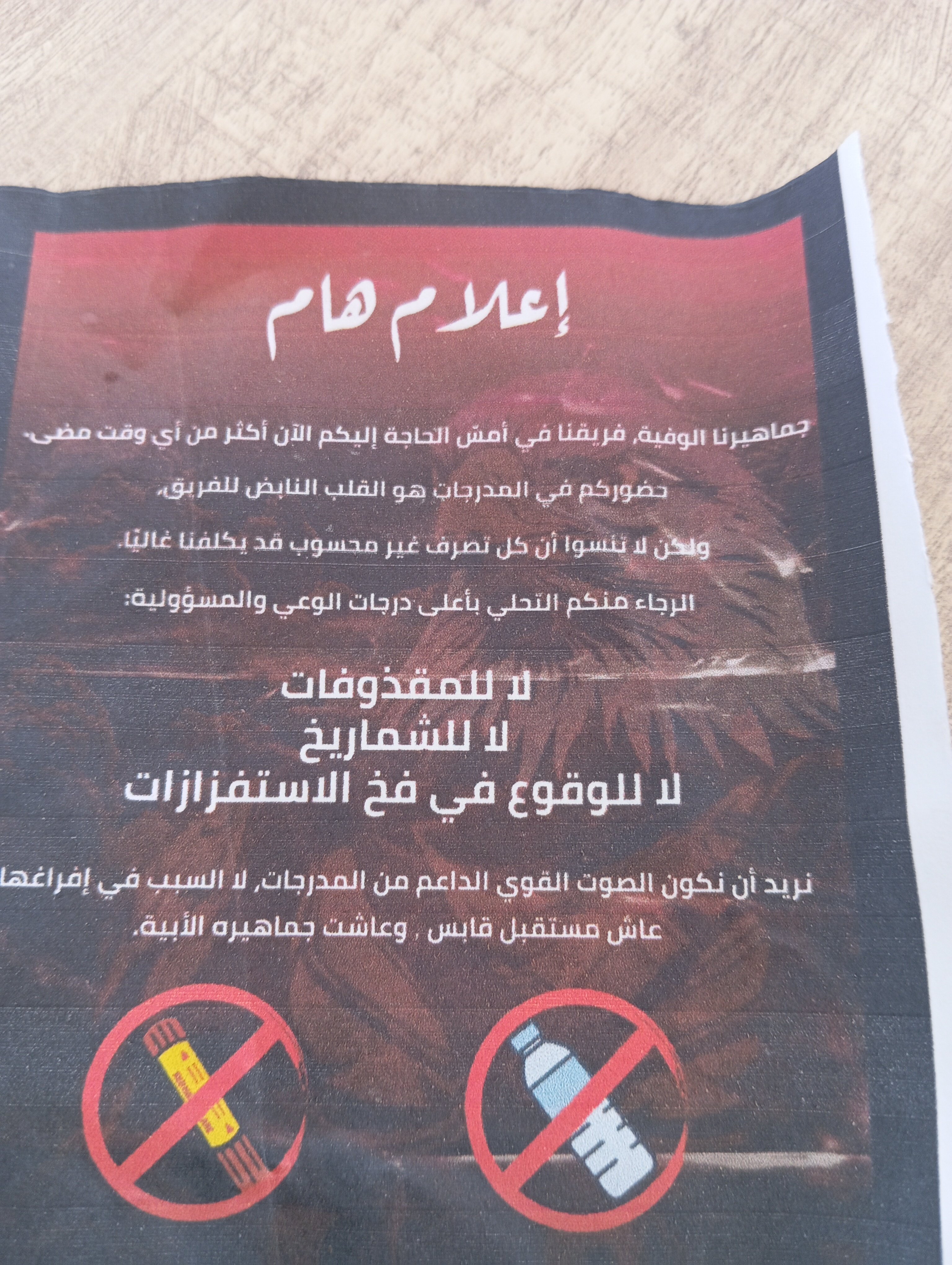قامت لجنة أحباء مستقبل قابس خلال مقابلة فريقهم ضد الترجي الجرجيسي، قبيل انطلاق اللقاء في مدارج معشب قابس بتوزيع قصاصات صغيرة على جماهيرها، ''تحذرهم فيها من رمي المقذوفات والشماريخ وضرورة تحلي بالصبر وتجنب الوقوع في فخ الاستفزازات حتى إن صدرت من المنافس''، لأن الجليزة في حاجة الى كل مشجع خاصة في ما تبقي من سباق البطولة الوطنية في قادم الجولات،وفقما جاء في القصاصة.