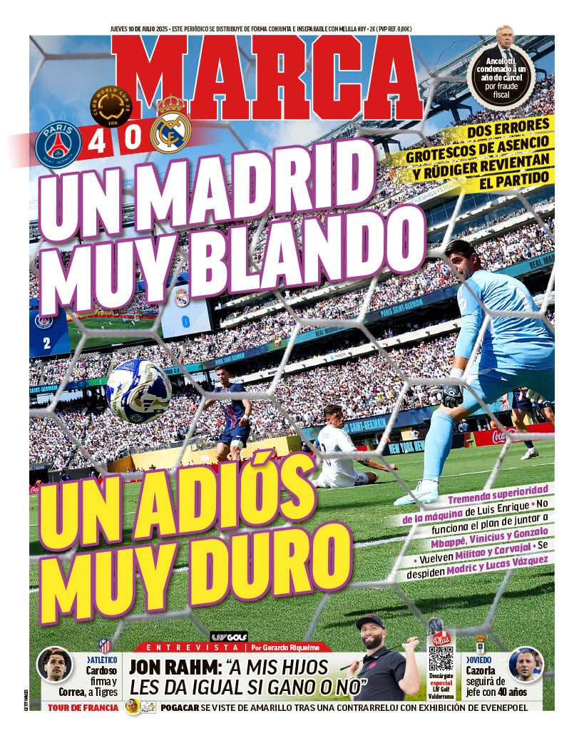 من جانبها، اختارت صحيفة Marca عنوان لافتتاحيتها "مدريد ناعمة جدا.. وداع صعب جدا"، مضيفة أن مدرب ريال مدريد تشابي ألونسو أخطئ بإقحام كيليان مبابي وفينيسيوس جونيور وغونزالو غارسيا معًا في خط الهجوم منذ البداية.